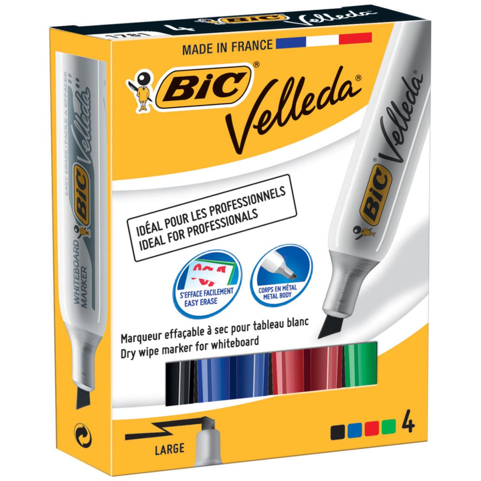 De Bic Whiteboardmarker Velleda 1781 doos van 4 stuks in geassorteerde kleuren is bedoeld voor het schrijven op witbord. Deze markers zijn ideaal voor presentaties, brainstormsessies en andere situaties waarin een flexibele en leesbare schrijfmethode nodig is.