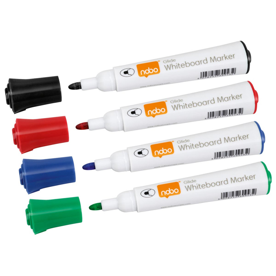 Gebruik de Nobo Glide whiteboardmarkers om helder en duidelijk te schrijven op whiteboards of andere geschikte oppervlakken. Draai de dop los, schrijf of teken, en veeg schoon met een droge doek of wisser; de inkt laat zich eenvoudig verwijderen en droogt snel op.