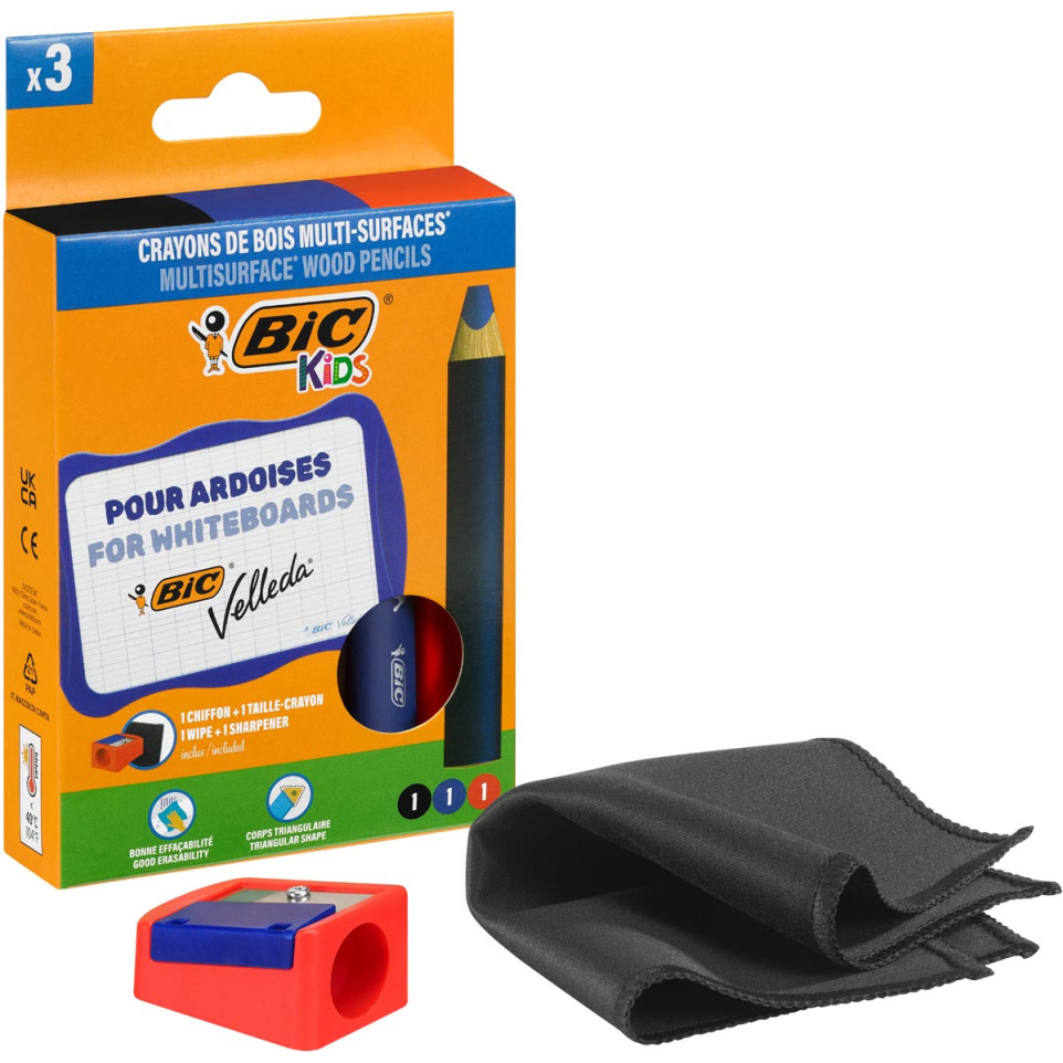 Het Bic Kids potlood voor whiteboards Multisurface is een veelzijdig whiteboardpotlood in een etui van 3 stuks met geassorteerde kleuren. Tekent, schrijft en kleurt moeiteloos op whiteboards, keramiek, glas en karton. Inclusief slijper en doek.