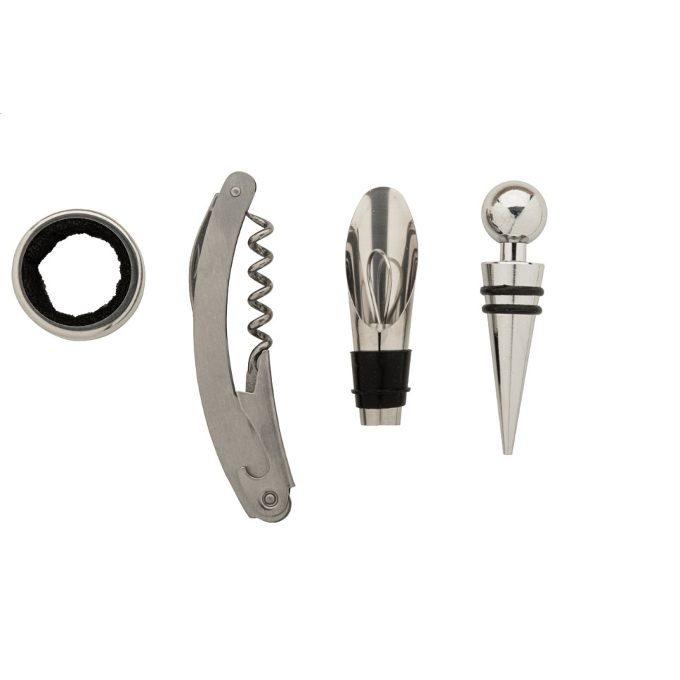 Praktische 4-delige wijnset van roestvrij staal in een flesvormige bamboe kist, inclusief kurkentrekker, druppelstop, schenktuit en flessenstop. Ideaal voor thuisgebruik, cadeau of als accessoire tijdens sociale gelegenheden.