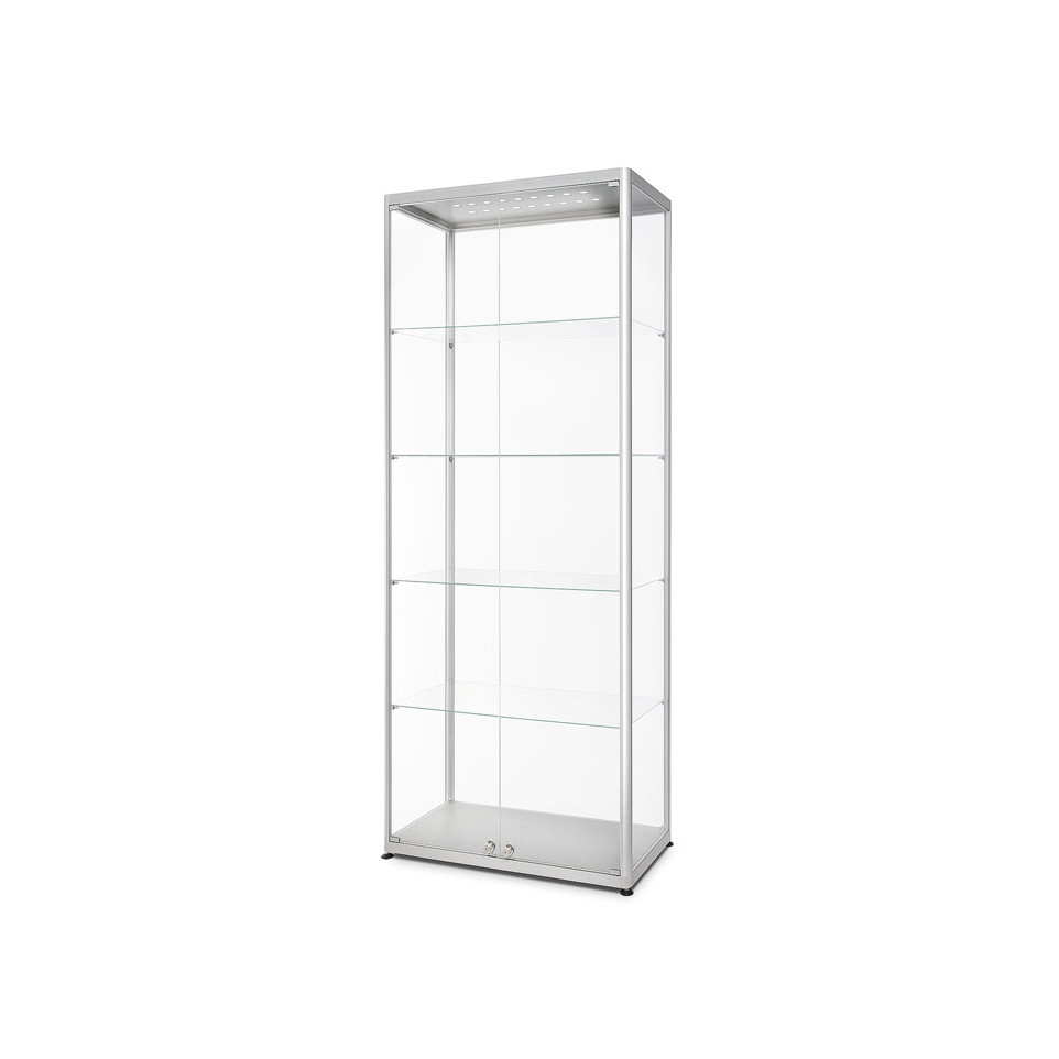 Deze glazen vitrinekast met LED-verlichting en dubbele deuren is ideaal voor het tentoonstellen van waardevolle items of collecties. Perfect geschikt voor gebruik in winkels, showrooms, musea of thuisomgevingen.