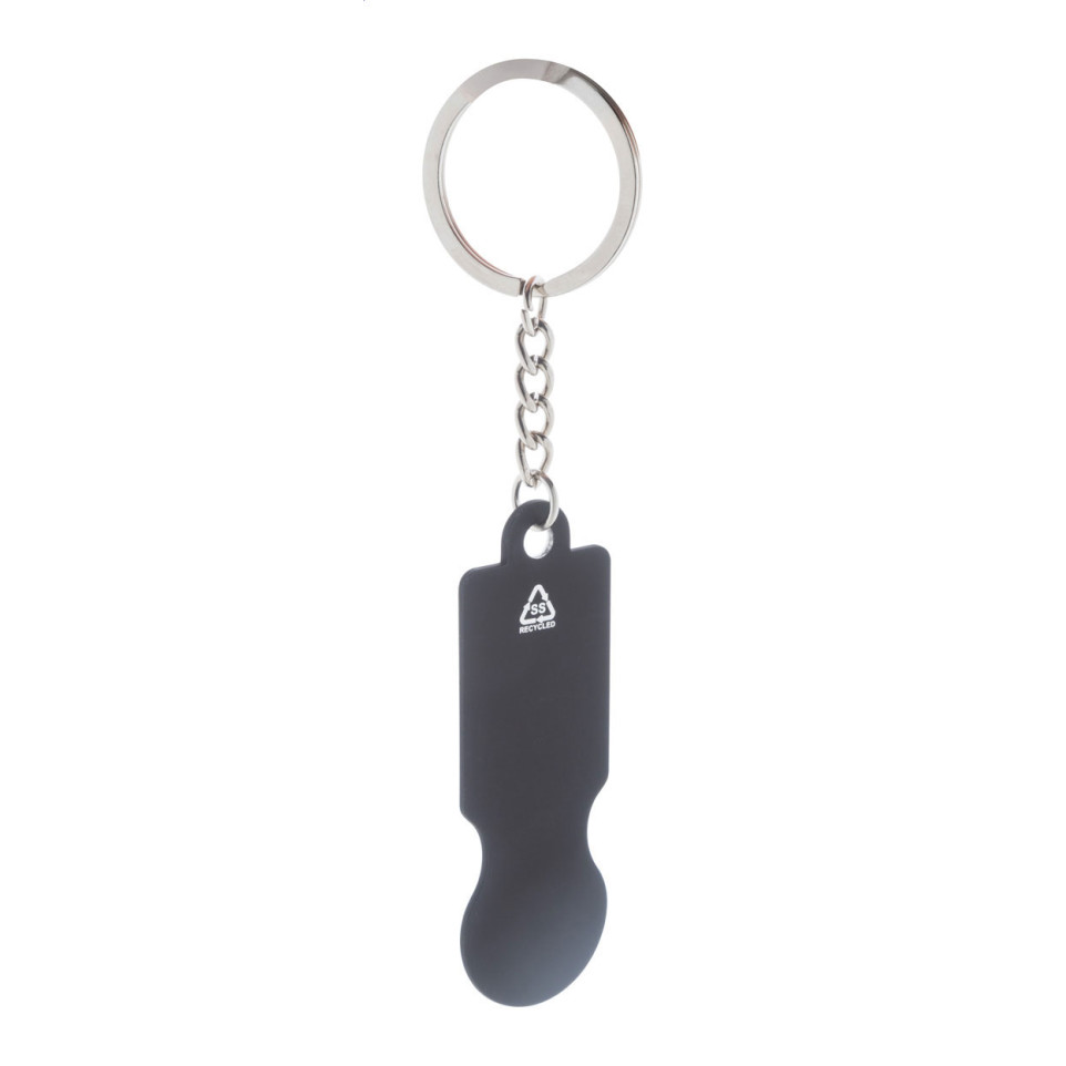 De sleutelhanger is vervaardigd uit gerecycled roestvrij staal met een rubberen afwerking.