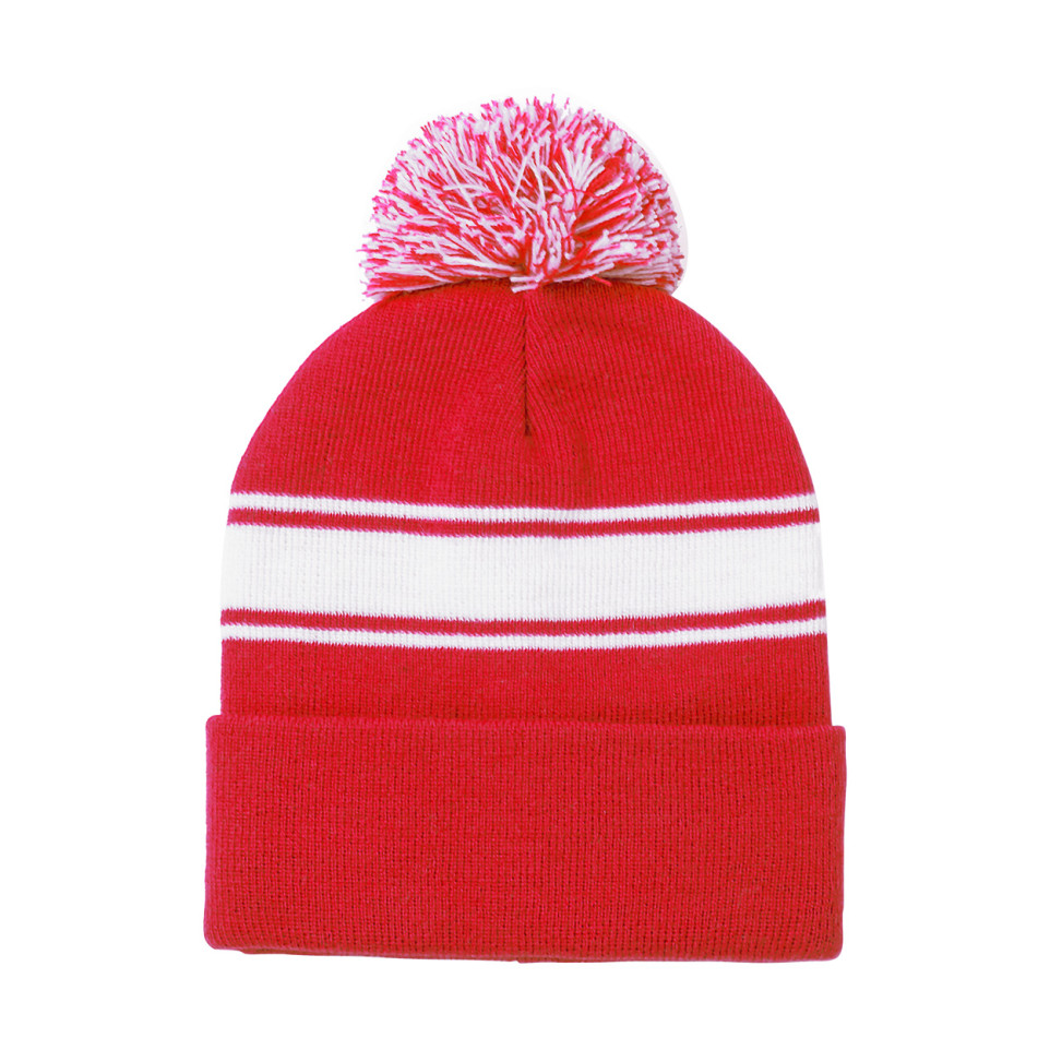 Comfortabele rode wintermuts met speelse witte strepen en een bijpassende pompon. Ideaal voor dagelijks gebruik tijdens koude dagen en winterse activiteiten.