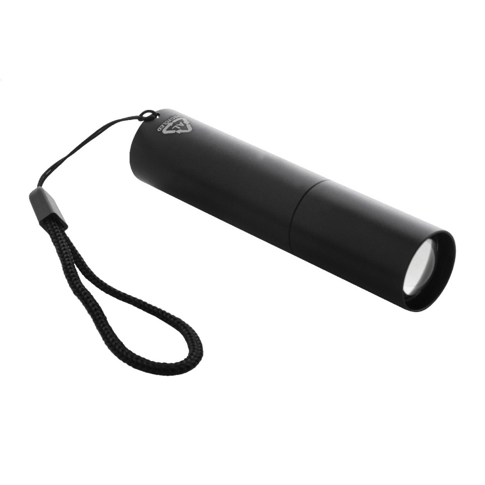 Draagbare en herlaadbare zaklamp van gerecycled aluminium, voorzien van een ingebouwde 400 mAh USB-batterij en een handige draagriem. Ideaal voor dagelijks gebruik, tijdens het kamperen of op de werkvloer.