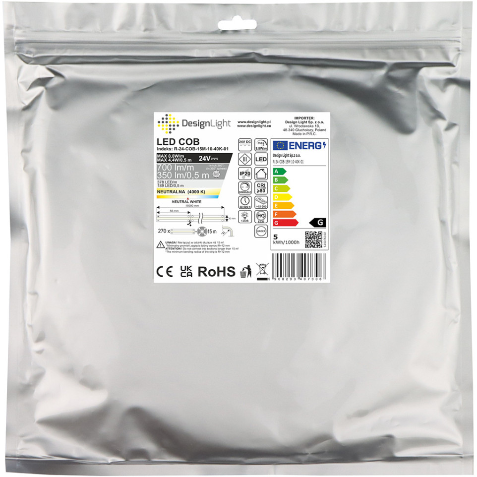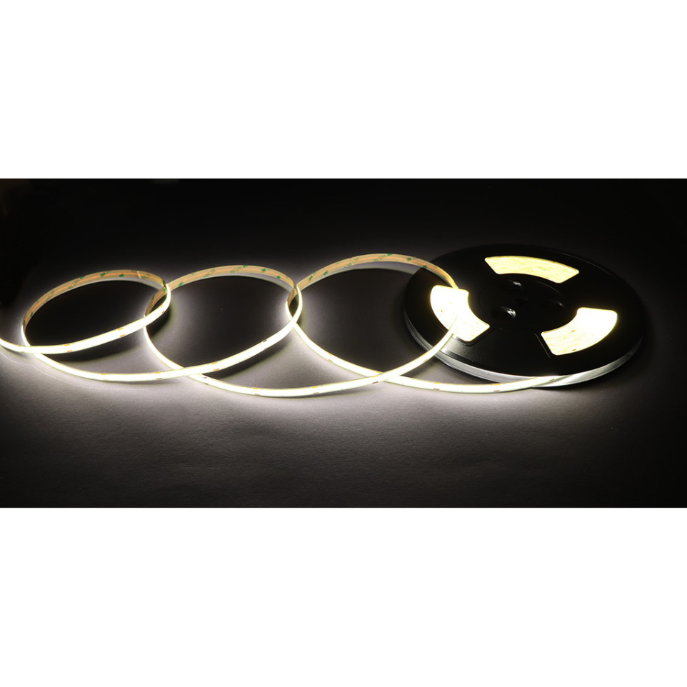 De COB LED-strip werkt op een veilige laagspanning van 24 volt. Sluit hem via geschikte voeding rechtstreeks aan en plak de strip eenvoudig langs gladde oppervlakken. Door het hoge aantal LEDs per meter ontstaat een egaal verlichte lijn zonder schaduwen of vlekvorming.