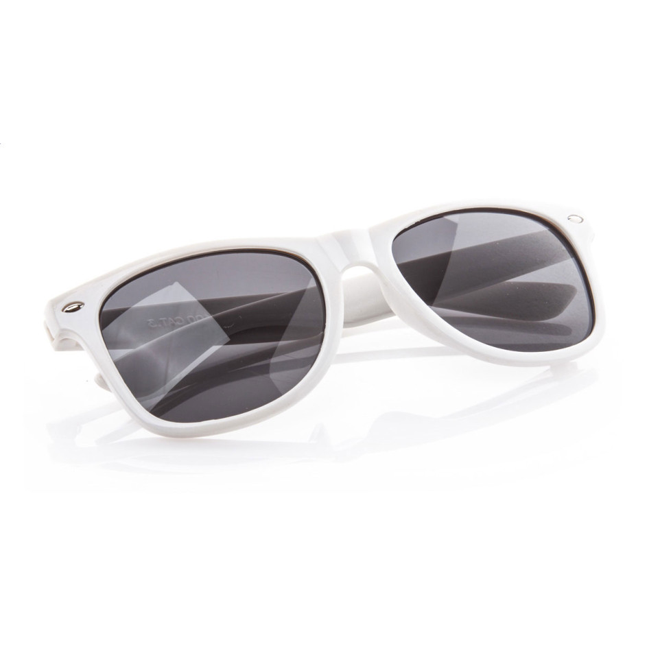 Witte plastic zonnebril met UV 400 bescherming, ideaal voor dagelijks gebruik tijdens zonnige dagen, op het strand, tijdens evenementen of festivals.