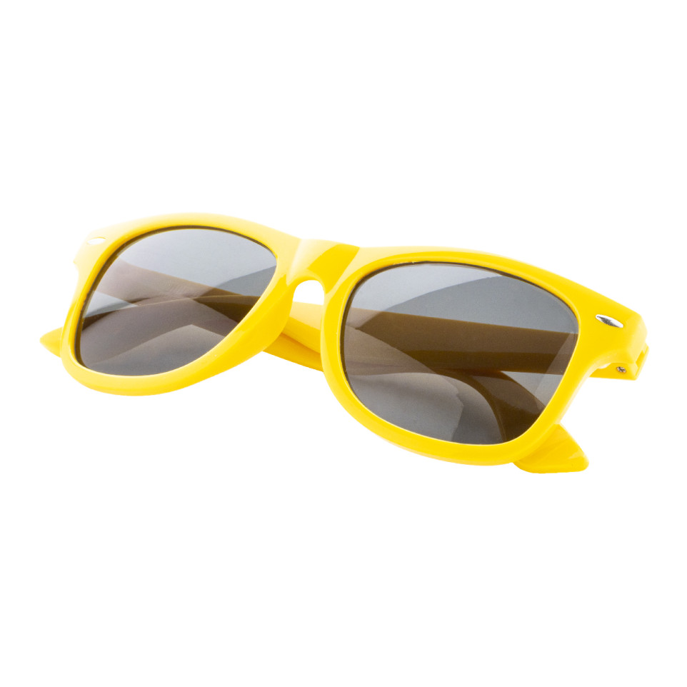 Stijlvolle Uluwatu gele zonnebril van RPET met UV 400 bescherming, ideaal voor dagelijkse buitenactiviteiten, evenementen of zomerse promoties. Comfortabel draagbaar en geschikt voor diverse weersomstandigheden.